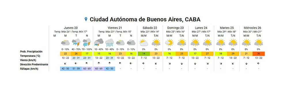 La situación se vuelve más complicada hacia la noche: el SMN prevé tormentas fuertes, actividad eléctrica y ráfagas que podrían acercarse a los 69 km/h, junto con precipitaciones que podrían rondar los 30 milímetros. La temperatura oscilará entre los 17°C de mínima y los 26°C de máxima.